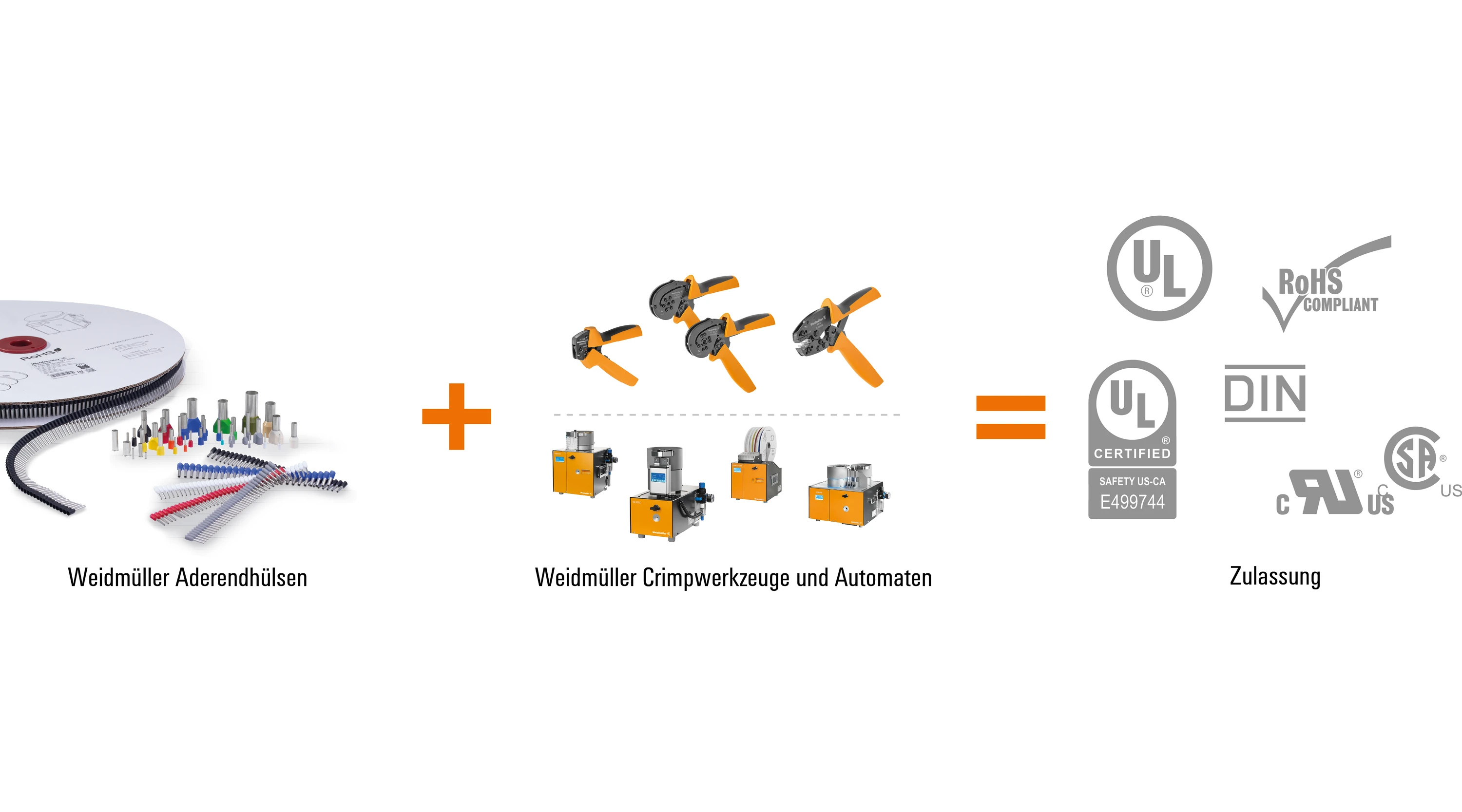 L'agrément UL diffère des standards conventionnels parce qu'il est délivré après des tests approfondis dans des laboratoires d'essai dédiés. Les embouts de câble sont toujours testés dans le cadre d'un système avec leur outil de traitement selon UL 486 F et reçoivent un agrément conjoint. Les utilisateurs finaux peuvent tester si leurs matériaux sont certifiés dans le répertoire de certification en ligne UL : ( https://productiq.ulprospector.com/de ). Le numéro E pour les outils manuels et les machines de sertissage Weidmüller en combinaison avec les embouts de câble est E499744. Le standard UL 486 F suit de près le standard allemand DIN 46228.